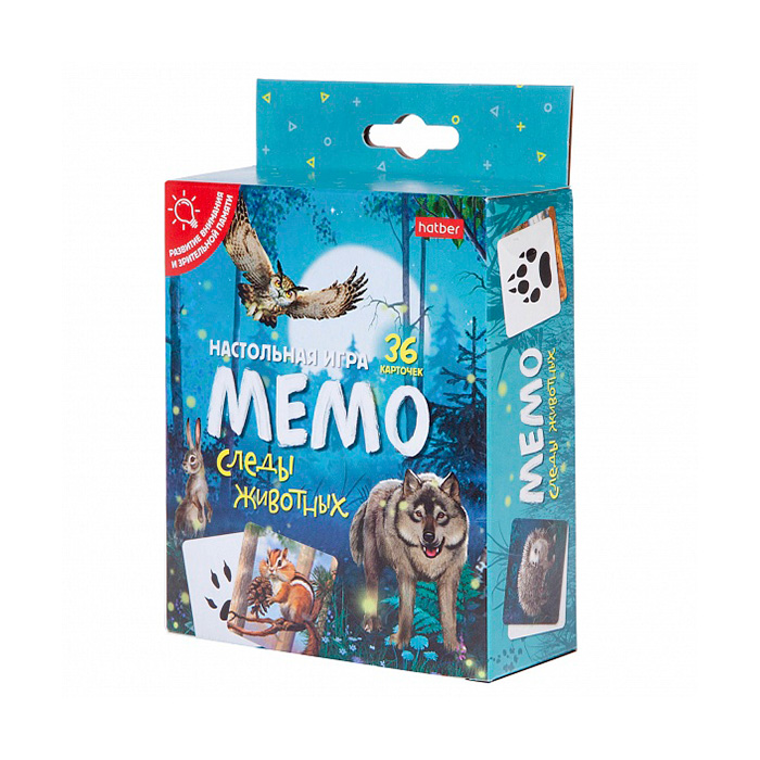 Настольная игра МЕМО расширяет кругозор, развивает внимание, тренирует память. Подходит для детей и взрослых любого возраста! Набор содержит 36 карточек, разделенные на 18 пар, на которых изображены различные рисунки. Карточки тактильно приятные, запечатанные с двух сторон, дополнены глянцевой ламинацией. Условия и варианты игр - указаны на обороте, имеет дополнительную игру - НАЙДИ ЧЕЙ СЛЕД! Компактная эргономичная упаковка, которую всегда можно взять с собой.