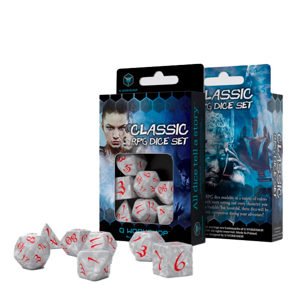Набор Classic Pearl & Red – это 7 кубиков (D4, D6, D8, D10, D%, D12, D20) в красивом дизайне.