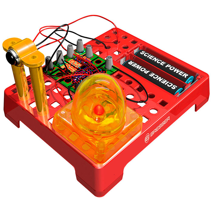 Bresser Junior «Датчик звука» – набор для экспериментов, с помощью которого можно собрать работающий датчик звука и познакомиться с принципом работы настоящей микросхемы. Порядок сборки и работа устройства подробно описаны в прилагаемом руководстве, поэтому ребенок вполне сможет использовать набор без помощи взрослых. В результате сборки получится прибор, который будет реагировать на звуки в помещении. При превышении заданного уровня громкости на микросхеме будет загораться светодиод.