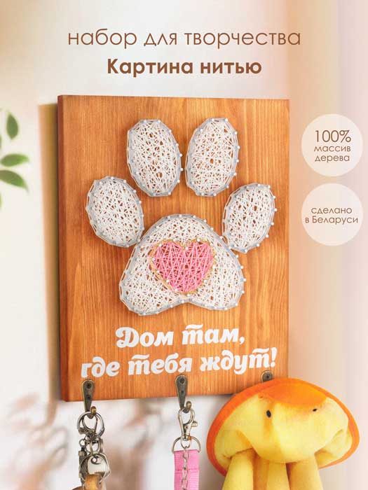 Оригинальная картина с полезной функцией имеет стильные крючки для полотенец и аксессуаров любимого питомца. Картина из нитей с милой надписью станет приятным акцентом в декоре дома, а оформленная таким образом вешалка с крючками для прихожей будет радовать глаз и удивлять гостей.