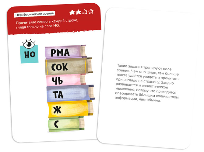 Индивидуальный тренинг позволяет ребёнку максимально сконцентрироваться на задании и даёт время обдумать решение. Это базовый вариант игры, при котором мы советуем давать ребёнку не больше 5 карт с заданиями разной сложности и направленности, чтобы ему всегда хотелось ещё. При таком варианте, хорошо выбрать несколько дней в неделю для регулярных занятий.
