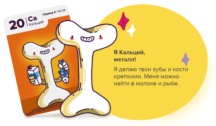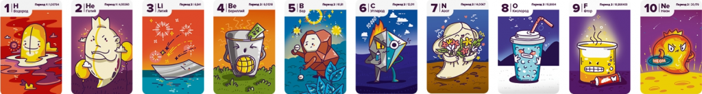 Специально для игры были разработаны авторские иллюстрации: 94 ярких образа химических элементов. В каждом образе отображаются важные свойства химического элемента, которые легко запоминаются на образном уровне.