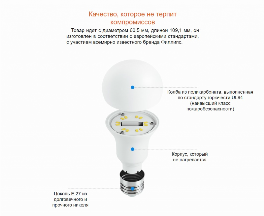 Лампочка получила высший класс энергоэффективности, а также несколько технологий защиты (от перегрева, короткого замыкания, повышенной нагрузки, перепадов тока). Поэтому она прослужит вам несколько лет (не менее 15000 часов беспрерывного горения).