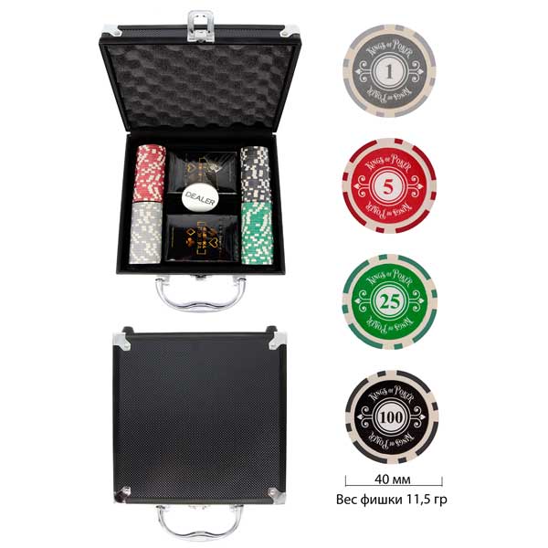 Набор из 100 покерных фишек с номиналом для полноценной игры в покер! Делайте ставки со вкусом, а превосходный черный кейс поможет вам хранить фишки и брать их с собой. Этот набор сочетает в себе отличное качество, прочность и долговечность материалов и стильный дизайн, он поможет вам сделать любую партию интересной и незабываемой.