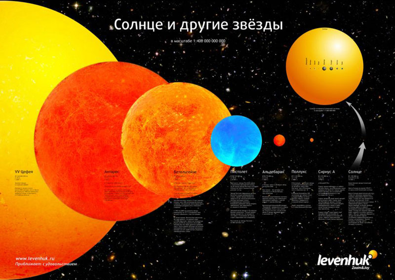 На постере «Солнце и другие звезды» показаны сравнительные размеры Солнца и некоторых других звезд: VV Цефея, Антареса, Бетельгейзе, Альдебарана и других. Это позволяет увидеть, насколько небольшое наше Солнце (а тем более Земля) в сравнении с гигантскими звездами, существующими во Вселенной.