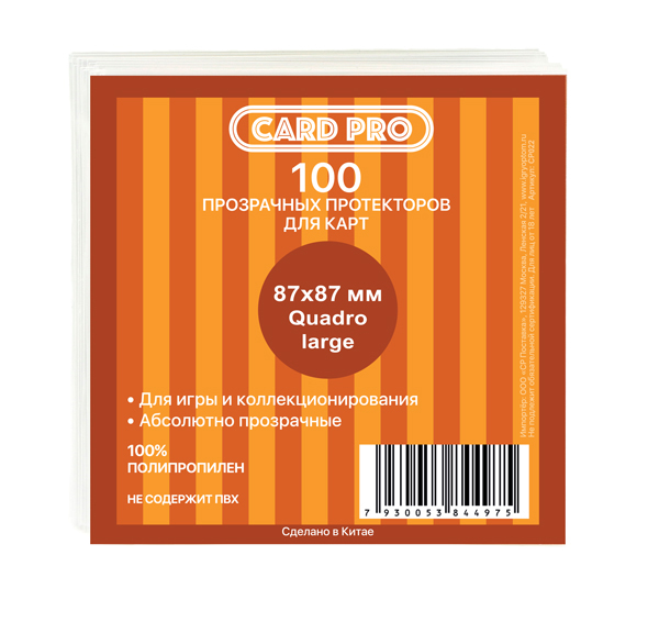 Упаковка из 100 прозрачных протекторов Card-Pro для карт. Абсолютно прозрачные протекторы размером 87х87 мм вмещают в себя карточки шириной до 86 мм и высотой до 86 мм включительно. Толщина стенки протектора - 40 микрон (микрометров). Изготовлены из 100% полипропилена без использования ПВХ.