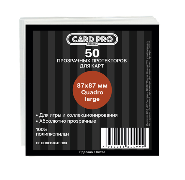 Упаковка из 50 прозрачных протекторов Card-Pro для карт. Абсолютно прозрачные протекторы размером 87х87 мм вмещают в себя карточки шириной до 86 мм и высотой до 86 мм включительно. Толщина стенки протектора - 80 микрон (микрометров). Изготовлены из 100% полипропилена без использования ПВХ.