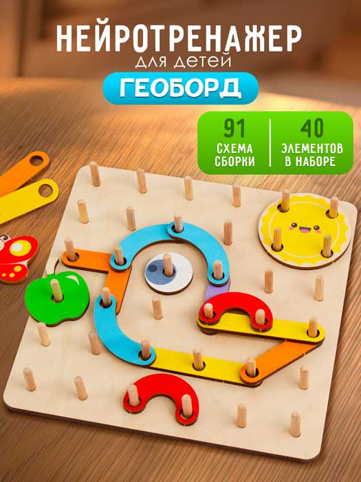 Геоборд деревянный – нейротренажер для развития речи и мышления. Эта увлекательная развивающая игрушка представляет собой доску со штырьками, между которыми размещаются детали, создавая разные фигуры, формы, буквы и цифры. Игра для развития речи – стимулирует речевые центры через мелкую моторику. Развивает мелкую моторику, что напрямую влияет на развитие речи. Используя как математический планшет, вы знакомите ребенка с формами, симметрией, счетом, основам геометрии и логики, отличный способ для изучения цифр и букв. Головоломка для тренировки пространственного мышления безопасная, экологичная и увлекательная. Универсальная развивашка для малышей - играйте и обучайтесь с удовольствием.