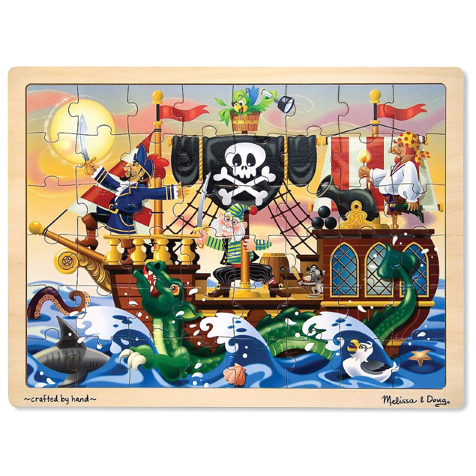 Малышу нужно будет из 48 элементов разной формы собрать красивую картинку, на которой изображен пиратский корабль, готовый отправиться в морское путешествие.