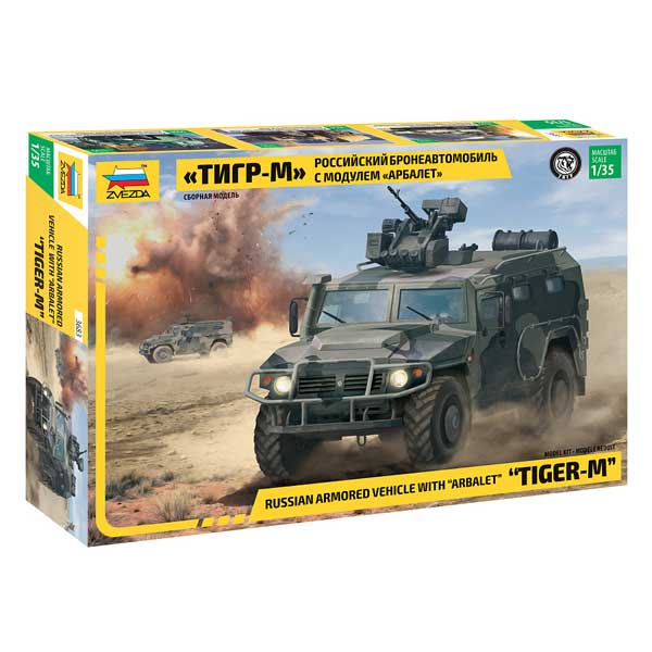 Бронеавтомобиль «Тигр» с дистанционно управляемым боевым модулем «Арбалет» – российский многоцелевой автомобиль повышенной проходимости, бронеавтомобиль, армейский автомобиль-внедорожник. Предназначен для перевозки людей и различных грузов по дорогам и бездорожью. Автомобиль демонстрировался на выставке «Армия-2016». В состав модуля «Арбалет» входит пулемёт калибра 12,7 миллиметра «Корд» или пулемёт ПКТМ калибра 7,62 миллиметра, а кроме того, на нём установлены четыре пусковые установки дымовых гранат 3Д6, 3Д6М или 3Д17. «Арбалет-ДМ» полностью стабилизирован и имеет возможность захвата и автоматического сопровождения цели, что позволяет оператору вести эффективный огонь, как с места, так и в движении. Игрушка собирается при помощи специального клея, выпускаемого предприятием «Звезда».