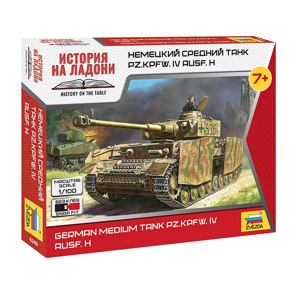 Историческая справка: Panzerkampfwagen IV (PzKpfw IV, также Pz. IV; в СССР был известен также как «T‑IV») — средний танк бронетанковых войск вермахта периода Второй мировой войны. Существует версия, что Pz IV изначально классифицировался немецкой стороной, как тяжёлый танк, однако документально она не подтверждена. Самый массовый танк вермахта: выпущено 8686 машин; серийно выпускался с 1937 по 1945 год в нескольких модификациях.