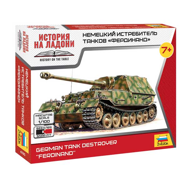 Всего было построено около 90 таких самоходных артиллерийских установок. Модель "Фердинанда" разработана при помощи новейших 3D технологий. Детали стыкуются между собой без каких-либо затруднений модель может быть собрана без использования клея.