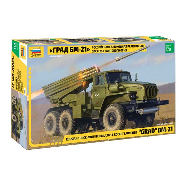 Историческая справка: «Град» – это 122-мм реактивная система залпового огня производства СССР. Она предназначена для поражения открытой и укрытой живой силы, небронированной техники и бронетранспортёров в районе сосредоточения, артиллерийских и миномётных батарей, командных пунктов и других целей. Взята на вооружение в 1963 году. Модернизированный вариант БМ-21 «Град» выполнен на базе грузового автомобиля Урал-4320 высокой проходимости. Он имеет автоматизированную систему управления наведением и огнём, аппаратуру подготовки и пуска, а также спутниковую навигационную систему. РСЗО «Град» на данный момент является самой распространённой машиной этого класса. Также производством «Градов» занимаются Китай, Египет, Ирак, Иран, Румыния и ЮАР. Сегодня РСЗО «Град» числится на вооружении более чем в 30 странах по всему миру.