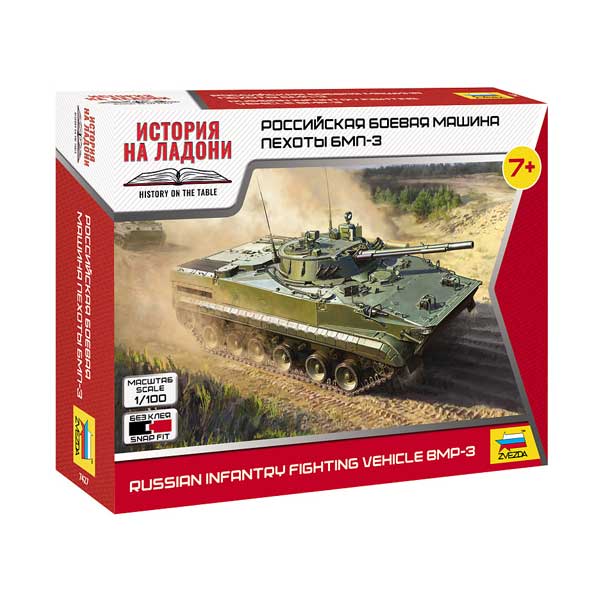 Российская боевая машина пехоты БМП-3 предназначена для транспортировки солдат и их огневой поддержки. Во вращающейся башне установлены 100-мм пушка, с возможностью запуска противотанковых управляемых ракет, а также скорострельная 30-мм автоматическая пушка и 7,62-мм пулемет ПКТ. Еще два пулемета для ведения огня по ходу движения установлены в передней части корпуса. БМП-3 разгоняется до 70 км/ч, способна плавать со скоростью до 10 км/ч и вести огонь на плаву. БМП-3 стоит на вооружении не только в России, но и во многих других странах мира.