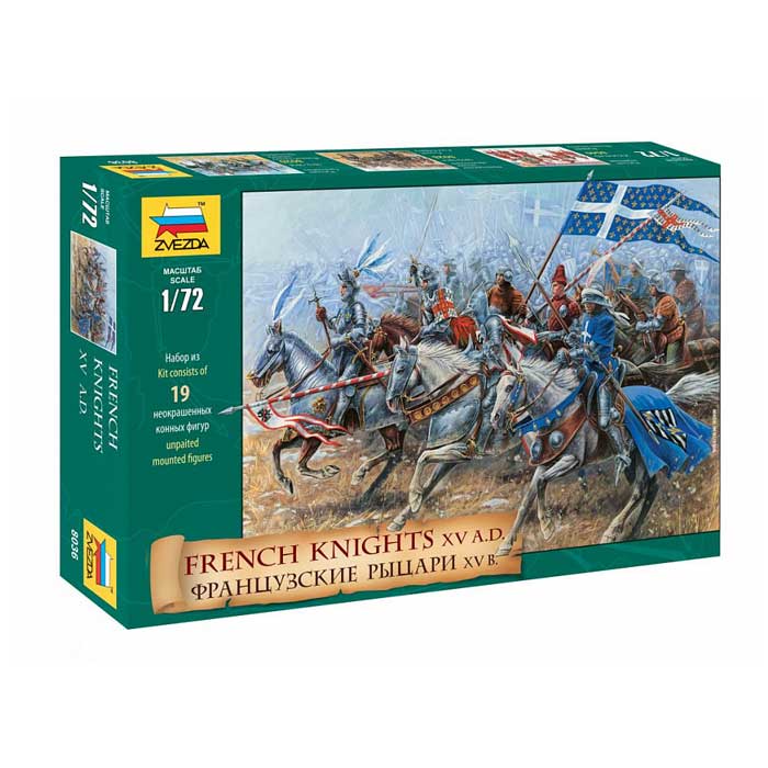 Эти полностью закованные в броню всадники участвовали в Грюнвальдском сражении, битвах завершающего этапа Столетней воины, войне Алой и Белой роз в Англии. В набор входит 19 неокрашенных конных фигур.