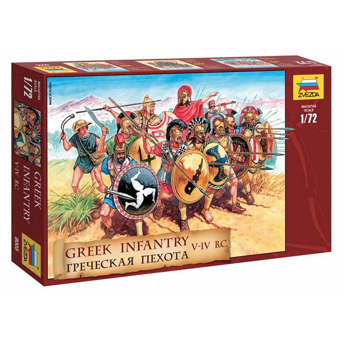Историческая справка: Греческая наемная пехота была снаряжена по традиционному спартанскому образцу: бронзовые гоплитские щит и шлем, однако панцирь и поножи отсутствовали. Воины были вооружены обычными для пехоты копьем и мечом и носили красную эксомиду (exotnis) — хитон со спущенным правым рукавом.