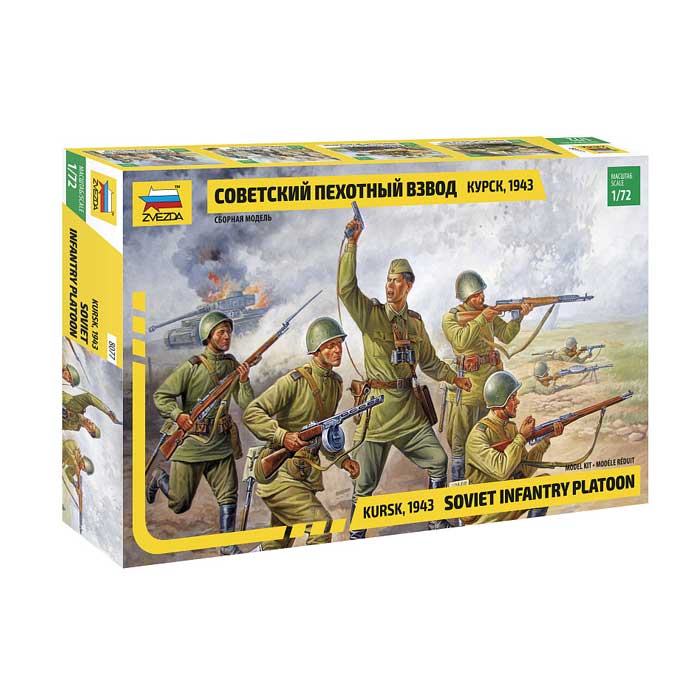Отлично выполненные фигуры, разнообразные позы и вооружение. Уникальность этого набора в том, что он полностью повторяет советский взвод, согласно штатному расписанию на июль 1943 года. То есть количество фигур и их вооружение соответствует историческим реалиям.