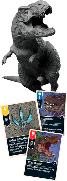 Однако невероятные размеры имеют и свои минусы: двигается Ти-рекс очень неторопливо, всего на 1 ячейку за ход. Правда, имеет несколько приёмов, которые позволят ей совершить мощный рывок к добыче. Но самое опасное в игре за Ти-рекса – расход карт. Ведь в конце каждого хода это чудовище добирает по одной карте, почти все атаки можно усилить, а низкая скорость перемещения намекает, что усиливать манёвры – тоже неплохая идея. Только вот помните, что если закончатся карты, ваш герой будет получать урон с каждым ходом. Так что иногда спешить всё же не стоит.