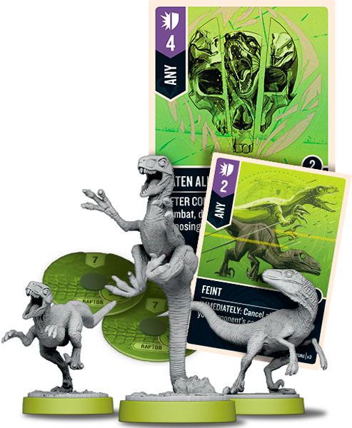 Уникальный «тройственный» герой – все рапторы считаются героями, каждый обладает своей фигуркой и собственным диском жизней. А в стае они втройне опасны, ведь любая их атака получает +1 за каждого другого раптора рядом с жертвой.