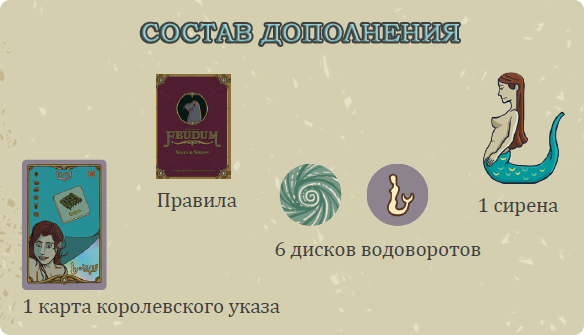 Если вы полагали, что в игре про фэнтезийное средневековье не хватает полуголой девицы с большими… хм… глазами, то это дополнение призвано исправить сей недостаток. Сирена — это новый монстр, который может стать для вас как неоценимым союзником, так и настоящим проклятьем. Перед началом игры по поселениям поля раскладываются закрытые диски водоворотов. Когда ваш подданный оказывается в таком поселении, диск переворачивается. Если на нём изображён тюлень и цвет диска совпадает с цветом одного из управляемых вами поселений, ваш подданный на долгое время становится сытым. Не спрашивайте, что случилось с тюленем. Если на диске изображена сирена и цвет диска совпадает с цветом управляемого вами поселения, вы приручаете эту дамочку. В противном случае ваш заворожённый подданный застревает в поселении, пока сирена не захочет выбрать себе новую жертву. Что до новой карты королевского указа, то она позволяет возделывать один из сброшенных жетонов земель в недосягаемости для других феодалов.