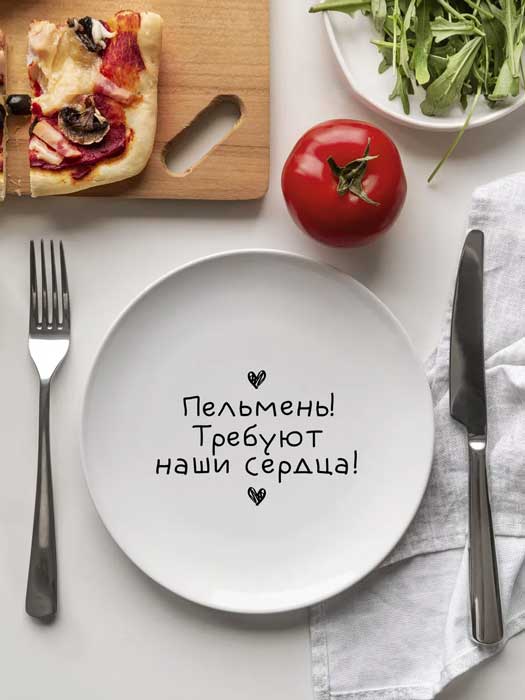 Прикольная тарелка с принтом "Пельмень! Требуют наши сердца!"