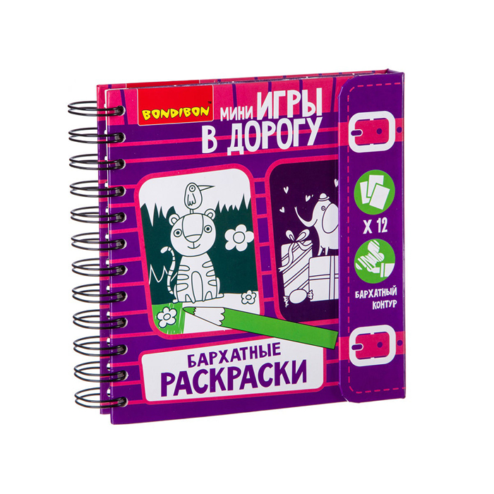 Забудьте о скучных путешествиях вместе с замечательными мини-играми в дорогу от BONDIBON Красочные и компактные, они помогут провести время весело и с пользой БАРХАТНЫЕ РАСКРАСКИ – это 12 забавных сюжетов для раскрашивания, расположенных на разноцветной бархатной бумаге. Выпуклый бархатный контур не позволит карандашу или фломастеру случайно выскользнуть за пределы раскрашиваемой зоны, поэтому рисунок получится ярким и аккуратным даже в дороге.