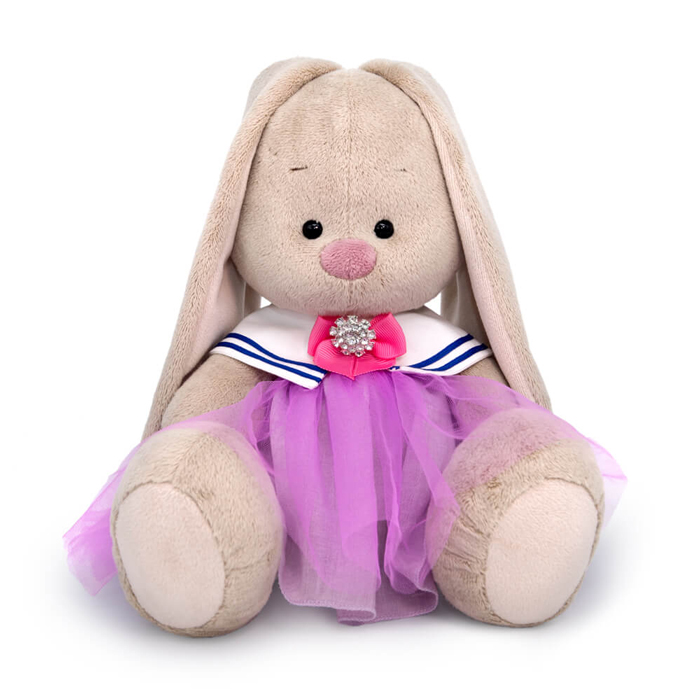Зайка Ми в нарядном комплекте с пышной двойной юбочкой и съемным воротником в морском стиле. Верхняя юбочка сшита из тончайшей сеточки цвета орхидеи, нижняя — из нежно‑сиреневой марлевки. Воротник украшен бело‑синей тесьмой и шикарным аксессуаром в виде репсовой розовой ленты и дорогой броши, усыпанной стразами.