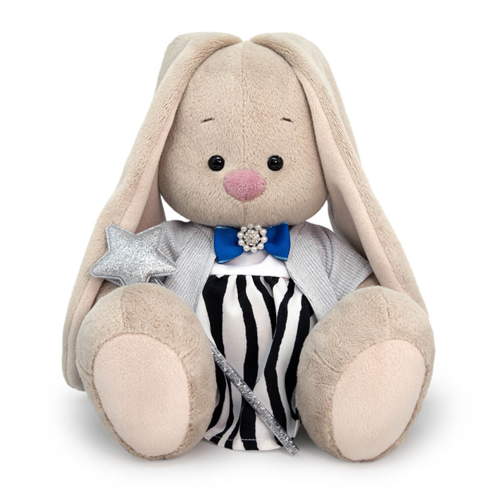 На Зайке Ми шикарный костюмчик волшебницы. Сарафанчик из двух тканей‑компаньонов, белый верх и низ из черно‑белой ткани с анималистическим принтом. Поверх сарафана болеро из очень модного серебристого трикотажа с люрексом. На шейке у Зайки необыкновенный бант, выполненный из синей сутажной ленты с серебристым краем. В середине банта богатая брошь, усыпанная жемчужинами и стразами. А в лапках Зайка держит необычный серебристый аксессуар — волшебную звёздочку на палочке.