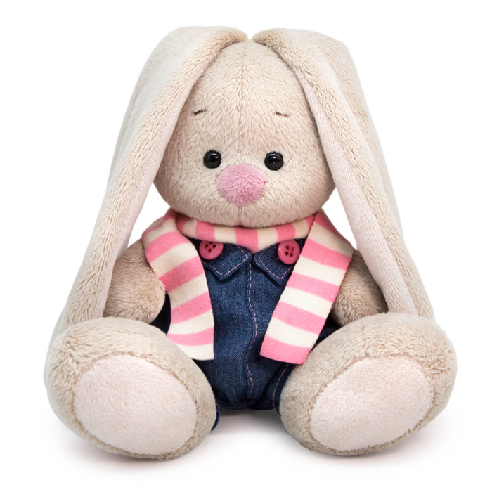 Малыш Зайка в милом комбинезоне, сшитом из модной в этом сезоне синей джинсы. Комбинезон на лямочках с розовыми пуговками. Также в комплекте узенький шарфик из мягкого софта в молочно‑розовую полоску.