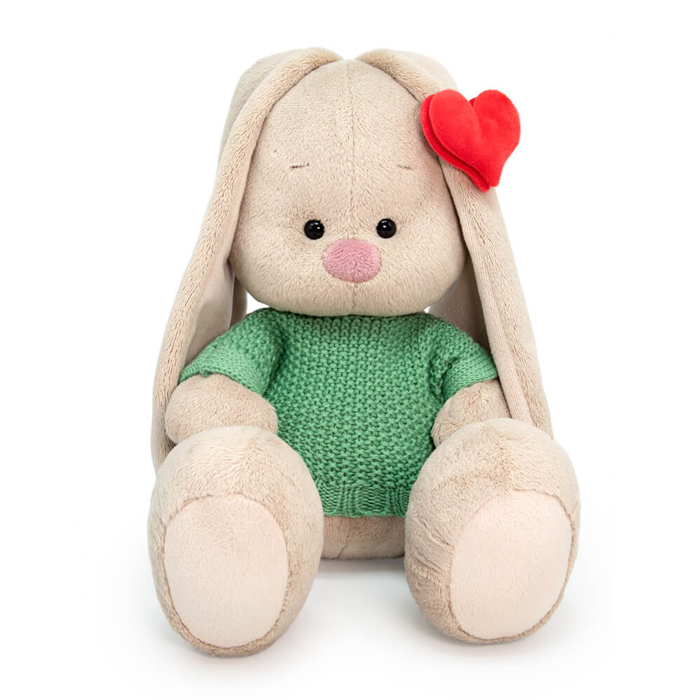 Зайка в очень милом и уютном свитере цвета полыни. Связан свитер из нежнейшего акрила. На ушке у Зайки двойное алое сердечко.